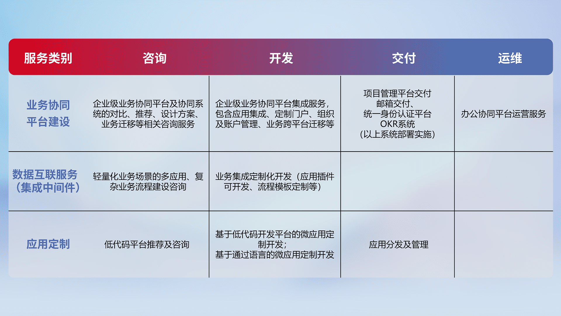 针对钉钉、、、、企微、、IDaas等平台级产品提供产品的规划、、、方案、、、、交付、、定制化开发等服务,,,实现如统一协同办公、、、、智能客户服务、、、混合会议管理、、、智能数据查询、、、、等业务场景,,实现数字化转型。。。
